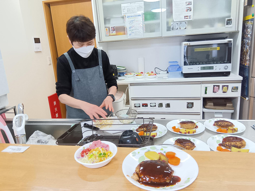 食事は近隣のスーパーでの食材購入に始まり、手作りの料理を提供しています。